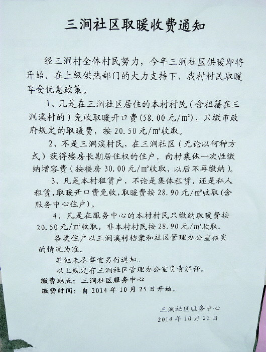 这样的收费让李先生很纳闷,“为什么我们租房者每年都要按每平方米28.90元交暖气费,而在小区里住的本村村民则只缴市政府规定的取暖费,按20.50元/㎡收取。同住一个小区,暖气费为啥有两种收费标准?”