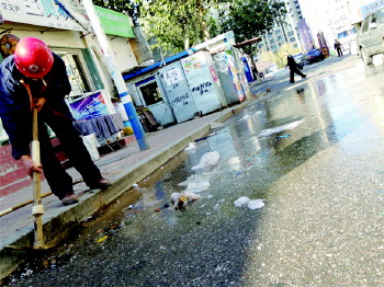 本报10月27日讯(记者 朱文朋) 27日,市民孙女士致电本报说在芝罘区白石路大世界站点路边,不断有水从一个小孔中冒出,水断断续续流了两条街。