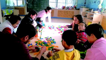 “Hi!”27日下午2点30分,志愿者张先生和三名外教丽莎、本、德班得一起来到儿童福利院,为孩子们带来欢乐的“英语知识之旅”。