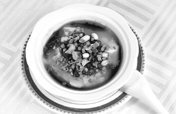 这位秦师傅的脑饭,就是以传统工艺为基础,又做了一些改进。每锅用等量的小米、大豆和适量的盐末,制作时先将小米淘净、晒干,磨成面,在锅里熬煮一定时间,使粥变稠变黏后装缸。然后将大豆上磨磨成渣,筛选去皮,用水泡好,上水磨碾成豆浆,再用细纱布包袱将浆包起来挤,挤出豆汁,熬熟。并用豆腐盐点到变嫩,点好一层向缸里打一层,每层都要加盐少许。然后在脑饭里放上特殊加工的茶绿豆,再在脑饭上面撒一层用香油炒好的丁状豆腐干和根红叶翠的菠菜末。这样,一锅黏稠适宜、色调诱人、口味纯正的宁海脑饭便算是做成了。百闻不如亲口体验,喝了秦师傅的脑饭,感觉就是好,香喷喷、咸丝丝,喝了还想喝,所以我常常是连续喝上两碗才肯离去。可惜,随着三马路一带的拆迁,再也喝不上他的脑饭了。
