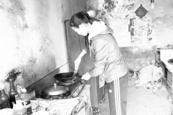 27日上午11点30分左右,王远仓回到家后,大家都围着三口人交谈时,爱心志愿者庞女士来到厨房,给王荣和贺晶明准备午饭。