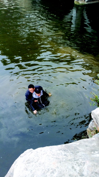 23日早晨,一小伙跳入宁阳金阳公园一处湖中轻生。在县信访局工作的靳贻龙路过,他不太熟练游泳,还是跳入湖中将人救起(如图)。 本报通讯员 摄
