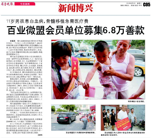本报10月27日讯(记者 李芳 见习记者 高梦超) 本报8月5日以《百业微盟会员单位募集6.8万善款》为题报道了百业微盟为博兴县锦秋街道付桥村患白血病的11岁男孩付安吉捐款一事。近日传来喜讯,小安吉干细胞移植手术顺利成功,目前情况稳定。