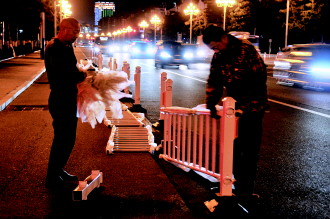 26日晚,在海滨北路的机动车道和非机动车道分界线上,工作人员冒着寒风连夜安装隔离护栏及相应辅助设施。连日来,市区各主要交通干道都在逐步增设隔离护栏,以隔离机动车道和非机动车道。