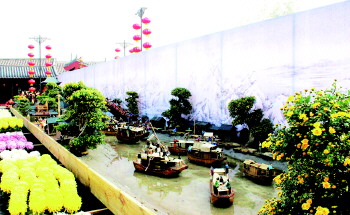 菊花版《清明上河图》,长24米,宽2.4米,依照《清明上河图》放大制作。20余组宋代建筑模型,近800个人物分布,数十艘漕运船只,近百匹车马牲畜,近千株各类菊花,数万枚盛开的花朵,全新诠释了《清明上河图》。原画中的树木和植物全部用盆景菊、悬崖菊、国庆菊等菊花替代,而且布展的菊花特别选择花期较长的品种。整个布展凸显菊花的主题,将菊花造型和古都文化相结合,将历史搬进现实,将文化注入展会,将盆景、雕塑、建筑、园林等多种艺术门类与宋文化巧妙融合,通过菊花的精心布展再现了北宋东京的繁华,为游客提供一道美轮美奂的文化、视觉盛宴。