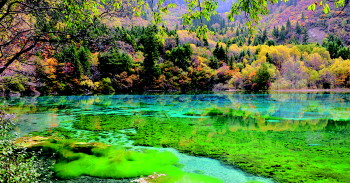 第二次到九寨沟是在2007年夏天。乘飞机到九寨,印象颇深的是从黄龙机场到九寨沟沿途。黛绿的森林,奔腾的溪水。这些森林和溪水的源头在九寨沟,夏天的九寨沟海子还是那样的湛蓝、透明、宁静,多了的是瀑布的轰鸣,珍珠滩瀑布,诺日朗瀑布,树正瀑布……热情奔放,飞花溅玉,神采飞扬,像一个个青春四射的小伙子,比赛似地展示自己的风采。