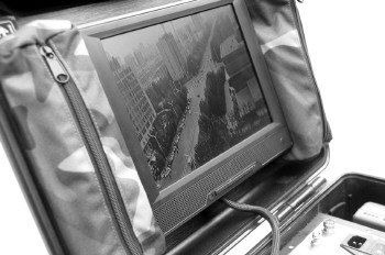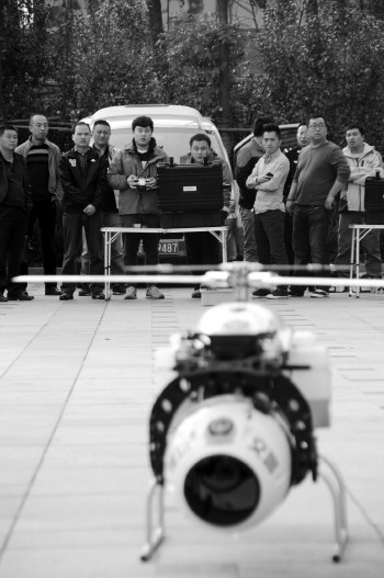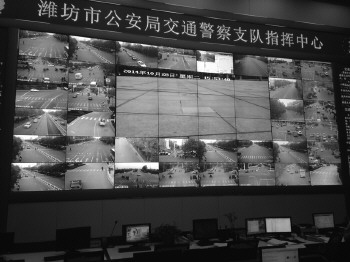 潍坊市交警支队指挥中心大屏幕上正显示着无人机拍摄到的画面。
