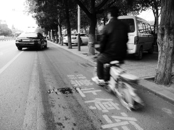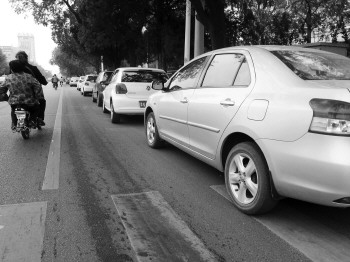 28日,在人民医院路段,市民担心被贴罚单,将车辆停上人行道(如左图),同样是禁停路段,在政府部门驻地外的道路上,却时常停满车辆,占用非机动车道。 本报记者 马志勇 摄