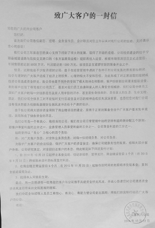 在民兴投资公司宁阳县总部,在大厅门口同样张贴着这一通知。通知称该公司资金主要用于投资建设位于宁阳县的一处商业楼,近期宁阳县一些投资理财公司倒闭,客户产生恐慌心理出现挤兑风波,该公司受到冲击和影响,原有筹备金不足以应对集中兑现情况,从10月22日起停止兑付本金、利息。该公司称,停止兑现期间记息挂息,2015年8月22日商业楼运营三个月后按承诺利息标准支付利息,2015年11月22日起按存款时间先后顺序兑现本金。该公司还表示,这一决定是和大部分客户协商、公司研究后所作出的。