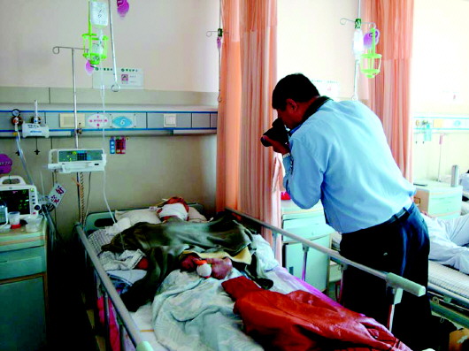 近日,济南市公安局高新分局巨野河派出所户籍民警林留信来到山大二院病房,为躺在特护病床上的60岁病危老人拍摄了一张特殊的二代身份证照片。老人户口在巨野河派出所辖区的一个村子,因病重在山东大学第二医院住院,身份证丢失。为帮老人尽快补办证件,民警来到病房为老人拍照办证。 本报记者 戚云雷 通讯员 齐刚 摄影报道