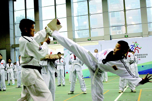 29日,天桥区中小学体育联赛在区体育馆开幕。共有45支学校代表队的500多名运动员,分别参加田径、篮球、排球、足球、乒乓球等项目的比赛。图为开幕式上制锦市街小学的学生表演跆拳道。 本报记者 李飞 通讯员 艾国庆 摄