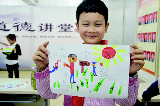 刘淳是一个外向活泼的小朋友,他在绘画中采用抽象的方式,来讲述身边的文明故事。