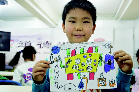 于承弘选择了“光盘行动”作为绘画的主题。在绘画中,于承弘呈现了一家人坐在一起吃晚饭的场景,“这个家里有爸爸、妈妈、哥哥、弟弟,一家人还没有吃完晚饭就各自忙自己的事情,妈妈忙着洗衣服,爸爸忙着看报纸,孩子则忙着玩玩具,桌子上还有很多剩饭、剩菜。”于承弘解释,这种做法是不对的,大家应该珍惜每一点食物,如果浪费一点食物,就等于不珍惜农民伯伯的每一滴汗水,每一份劳动。