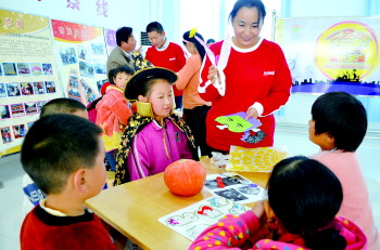 本报10月29日讯(记者 彭彦伟) 在万圣节来临之际,由本报与团东港区委、安利日照分公司联合举办的“汇聚爱心 传递温暖”安利志愿者关爱大行动走进竖旗小学。完全模拟万圣节情景带领孩子们度过了一个新奇愉快的下午。