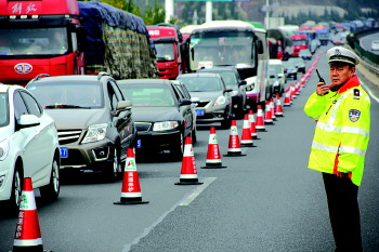 29日下午治理过程中,交警用锥桶挡住两个车道,过往车辆很快排起长队,大约一个小时左右,堵车已经超过1千米,过往车辆车速非常缓慢。交警将车辆导入服务区,仔细检查,隔一段时间看见堵车较长距离后,打开锥桶放行一部分再重新拦住。