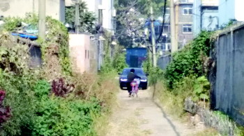 上午12点多,一辆轿车从土路向家属院驶来,沿途不断刮蹭两侧的杂草,行至中途时,对面驶来一辆电动车,两者都无法通行,持续了半分钟后,电动车主把车子搬到一旁的草丛中,车辆才得以通行。