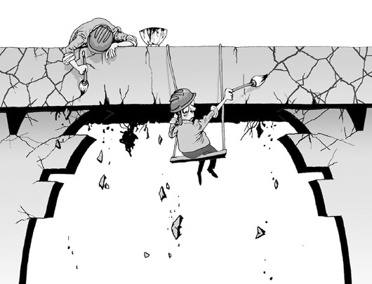 据《法治周末》报道,投资110亿元的山西岢临高速公路,还未通车就已出现桥梁隧道裂缝,路面沉降塌陷。更有知情者爆料,填充石缝的不是砂浆,而是石料加工厂废弃的石粉,甚至用墨汁画出“自然美观”的石缝,“从远处看十分漂亮,其实却是蒙人的”。 漫画/李宏宇