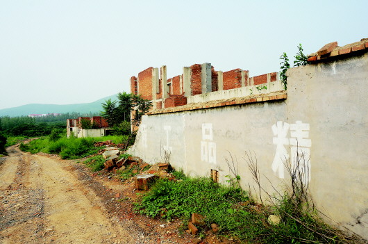 彩石山庄至今还是一片废墟,原来的围墙上还能看到标语“创精品工程”。本报记者 张頔 摄