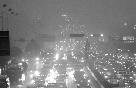 30日入夜时分,济南市区雾霾再度变严重,远处的建筑物在霾中若隐若现,而经十路因为众多机动车拥堵,雾霾更重。