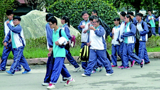部分学校为区分不同年级的学生还更换校服的颜色。“我们学校从建校到2012年,一直发放最初的校服,蓝色裤子,蓝白相间上衣,上衣后背写有SDJB四个字母。后来才更换颜色辨别每个年级的学生。目前高三生校服为红色,高二为蓝色。”山东省济北中学刘老师称。