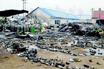 厂院内一片狼藉,瓶罐被烧后弹落得到处都是。 本报记者 韩逸 摄