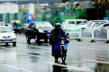 30日,一位男子在雨中行驶。 本报记者 张晓鹏 摄