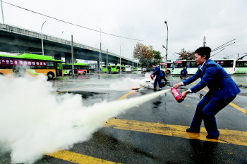 10月30日,在公交集团5路电车车队院内,30余名公交司机进行了冬季消防演练,在消防官兵的指导下,司机学习了灭火器材使用、公交车失火紧急处理等知识。随后,车队工作人员在公交车的轮胎上加装了防滑链,针对冬季车辆防滑进行了演练。 本报记者 杨广帅 蓝娜娜 摄影报道