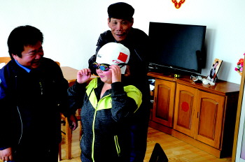 丁海丽在家中穿戴上游泳设备,给家人演示。