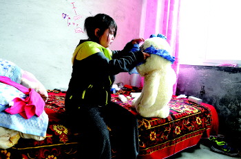 丁海丽给自己喜欢的毛绒熊穿衣服。