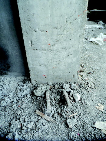 在张照清当时拍下来的照片里,两面墙上裸露出清晰的23根钢筋。后来施工队把其他钢筋弯折下去,埋到地面里。直到现在仍有几根钢筋露在墙体外。