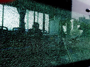 公交车右侧,靠近车后门的一块玻璃碎成了网状。这块玻璃宽高都约60厘米以上,风一吹偶尔还发出啪啪的碎裂声,虽然碎了,但没有散落开。在稍高一点的位置,玻璃上有个比较规则的圆孔,直径与中性笔芯粗细差不多。很可能就是这个位置遭到击打,导致这扇玻璃破碎。