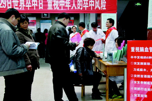 每年10月29日是“世界脑卒中日”。研究显示,脑卒中已成为我国第一大致残和致死的疾病,这其中不乏中年患者。29日上午,市人民医院神经内科专家在门诊大厅内免费为患者进行了义诊,并测量血压。同时发放宣传材料,向前来就诊的患者讲解脑卒中发病时的症状及日常需要注意事项。图为前来就诊患者正在进行咨询。