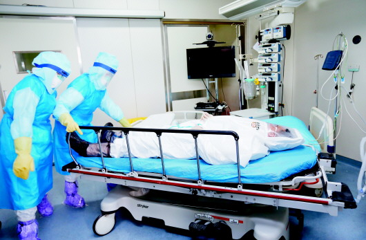 10月30日,北京地坛医院的医生在演练中将“疑似病人”送到ICU病房。 新华社发
