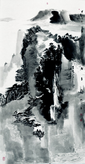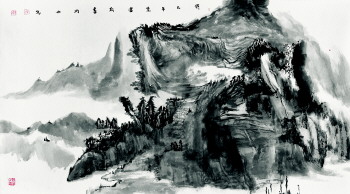 叶建新的山水画很少设色,此次展出的这一批黑白水墨作品就全部呈现了他的山水作品风格。叶建新的水墨山水艺术蕴涵了董其昌“画欲暗不欲明”的妙喻,深不可测的墨色中藏有“不尽之境”,明暗中蕴有“景外之景,意外之玄妙”,在深厚的笔墨中,对自然山水的迷恋和情怀跃然纸上。