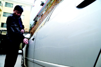 车身上两道长划痕让车主十分心疼。 本报记者 韩逸 摄