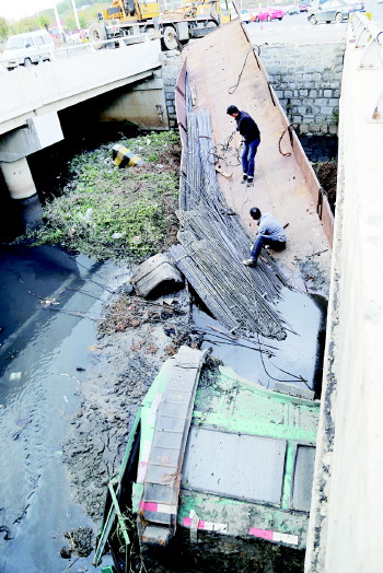 11月2日凌晨3时许,山海南路和轸大路交叉口,一辆满载几十吨钢筋的大货车撞上一辆三轮车,两车掉进路口的污水河内。目击者称,三轮车车主的老婆当场身亡,大货车和三轮车司机都安然无恙。污水河一边的警戒桩完全被撞飞,路政工作人员指出,大货车车主需进行路赔,货车也完全报废,直接经济损失在30万元左右。据了解,三轮车当时闯了红灯。目前,事故责任在进一步认定中。