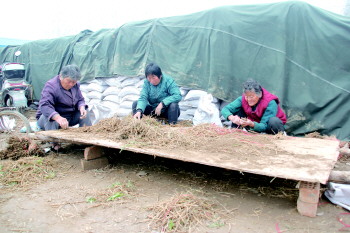 曹口村不少老人正在挑拣牡丹苗,她们忙一天挣到四五十元工资。