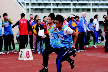 1日,青岛市第十四届残疾人田径运动会举行,来自十区市及青岛市盲校、青岛市中心聋校、市残疾人康复职业培训中心等14支代表队参加了比赛。图为盲人田径运动员携手奋进。