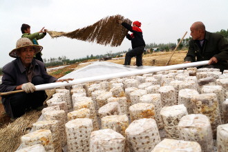 近日天气越来越冷,在枣庄市山亭区枫林家庭农场黑木耳种植区,职工们正给露天栽培的秋季黑木耳营养基加盖塑料薄膜和草苫子保暖,以适应黑木耳对生长温度的要求。 本报通讯员 赵连友 本报记者 袁鹏 摄影报道