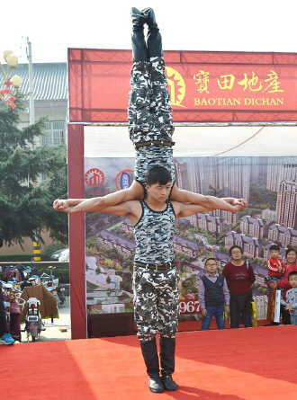 时间:2014年10月18日 自述:俩小伙在舞台上秀武艺,真是有十拿“十”稳的功夫。 点评:没练过的可万万不敢秀此技艺。