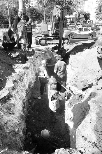 3日,南大街与大海阳路交叉口处,几名工人正忙着将路面挖开。记者了解得知,由于原来的污水管道狭窄,市排水处决定将路面挖开,更换成口径更粗的排污管道。 本报记者 吕奇 摄影报道