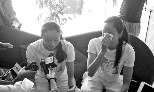 去年全运会,蒋文文、蒋婷婷姐妹赛后召开发布会,哭诉花游比赛中遭遇“暗箱操作”。(资料片)