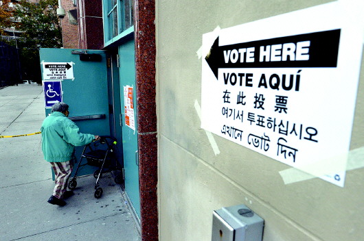 4日,在纽约,一名女子走进一处投票站投票,墙上贴有中英韩等多种文字书写的投票指示牌。新华/法新