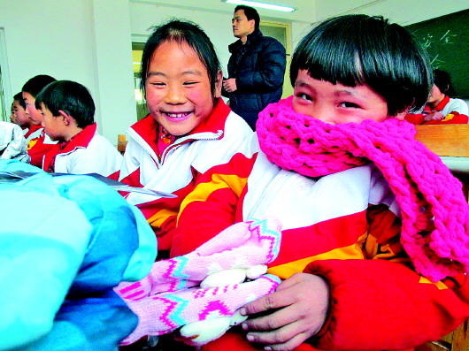 去年,长清龙湾小学的孩子领到御寒棉衣。 本报记者 肖龙凤 摄
