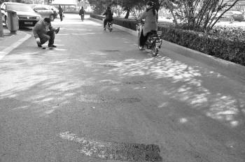 4日,洸河路与琵琶山路路口以西,非机动车道上的小广告密密麻麻,各种“贷款”、“办证”的小广告直接用黄色的油漆涂抹在地上,有一处不足50米的路面上,小广告竟达到了90多处。除非机动车道外,人行道砖、路沿石上也时常画上小广告,严重影响市容环境。