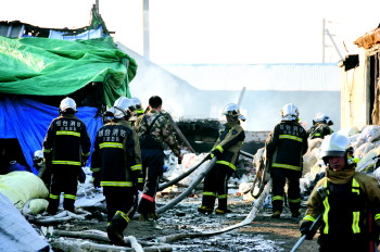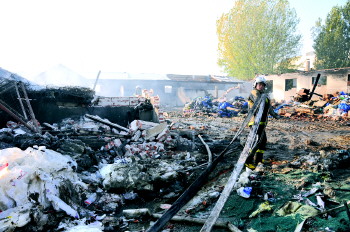 记者进入工厂院内,只见南侧堆放着一些塑料泡沫和塑料颗粒,还有一些被消防官兵从屋内抢出来的液化气罐,不少塑料颗粒和塑料泡沫已被烧成黑色灰烬。院内西侧有几间被烧塌的厂房,北侧的厂房已经坍塌,一些机器露在废墟中。“两侧房子加在一起得有20间,一些塑料颗粒被烧毁,估计损失不小。”进入院内的一位村民称,幸亏风不大,加上消防官兵来得快,要不然后果不堪设想。