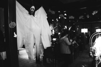 10月31日晚上,在谷德广场弗酪特咖啡,店面被装扮出万圣节的氛围。当天谷德广场推出了万圣节活动,惊悚派对、悬挂骷髅旗、南瓜灯、主题彩旗等,让前来购物的市民体验了一把万圣节的感觉。
