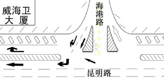 在海港路、昆明路交叉口,原有的一条右转车道改为两条右转车道,右侧的右转车道供从海港路驶出的车辆右转进入辅路,再右转驶入新威路;左侧的右转通道供从海港路驶出的车辆右转进入昆明路。在此提醒司机,该处右转通行与昆明路右转车辆略有冲突,过往司机不仅要减速慢行,从海港路驶出的车辆还应让行昆明路上的车辆。