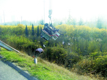 吊车将翻至路沟的救护车吊出。 本报通讯员 王军 摄