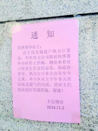 “因没安装进户热力计量表,热力公司今年将停止供暖。”,四季菁华物业2日贴出的通知让业主们震惊了。记者获悉,鸿阳热力公司希望将四季菁华小区的供暖系统纳入热力公司监管,但因系统改造费等问题,小区物业和热力公司协商未果,导致不能正常供暖。